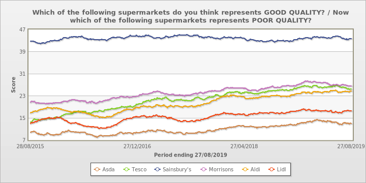 While YouGov’s BrandIndex shows consumer perception of Asda’s quality has largely been on an upward trajectory over the last four years, Asda is being outperformed by all the major UK supermarkets.