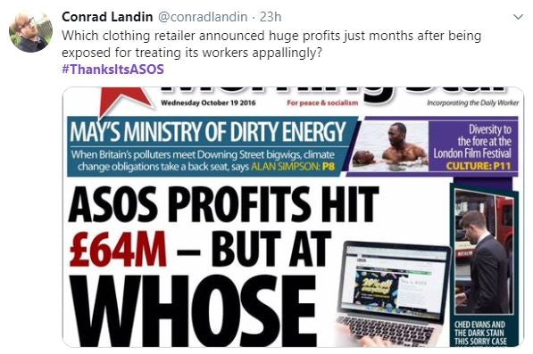 Many of the less complementary tweets draw attention to accusations of poor working conditions endured by Asos warehouse employees, while others highlight the detrimental impact fast-fashion is having on the environment.