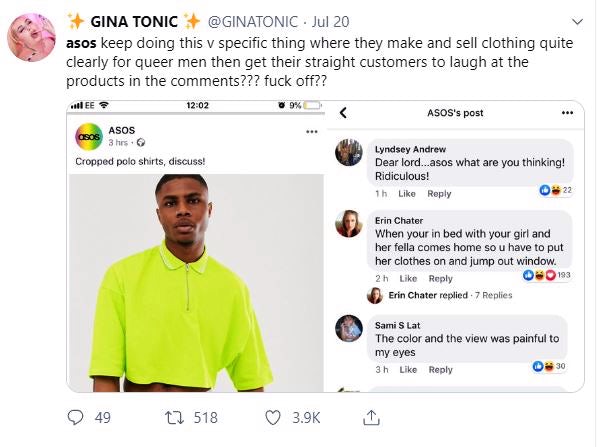 One user tweeted: “Asos keep doing this v specific thing where they make and sell clothing quite clearly for queer men then get their straight customers to laugh at the products in the comments??? fuck off??”