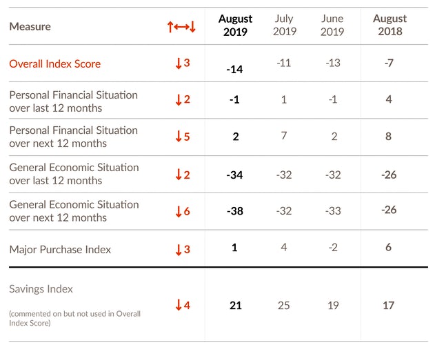 Consumers are not feeling great about their personal financial situation either, with those feeling like it has improved in the last 12 months decreasing by two points in August to -1, which is down five points year on year.