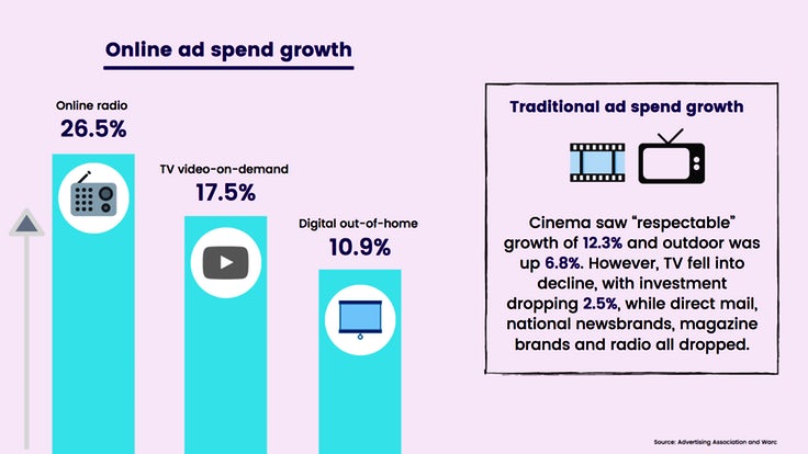Online advertising saw some of the fastest growth, with online radio the standout as spend increased 26.5% year on year in the first quarter. TV video-on-demand saw growth of 17.5% and digital out-of-home 10.9%.