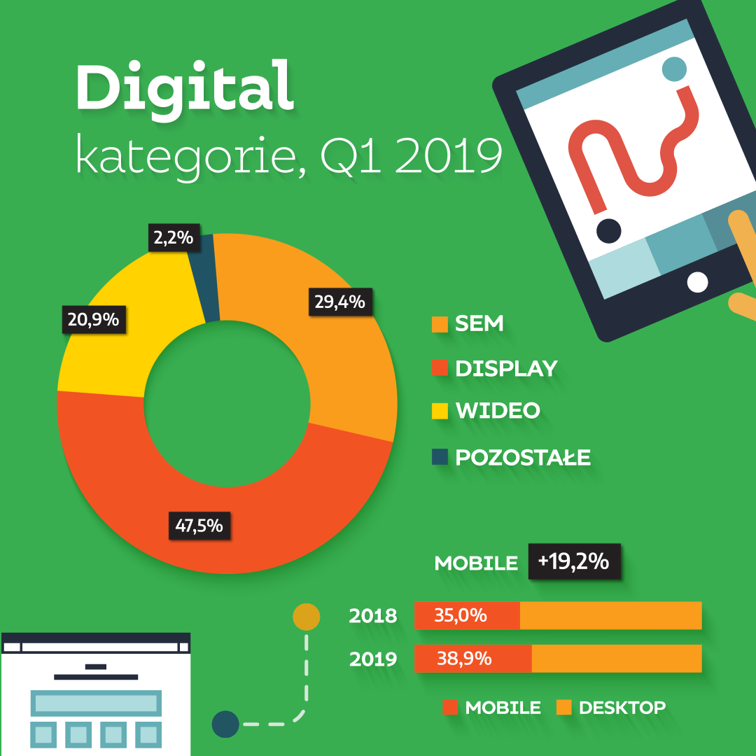 Natomiast wśród podstawowych typów reklam internetowych nadal dominuje display (47,5 proc. udziału w wydatkach w minionym kwartale) przed marketingiem w wyszukiwarkach (29,4 proc.). Na wideo przeznaczane jest już 20,9 proc. budżetów reklamowych w sieci. Nakłady na reklamy w mobile’u wzrosły w skali roku o 19,2 proc., a ich udział z 35 do 38,9 proc.