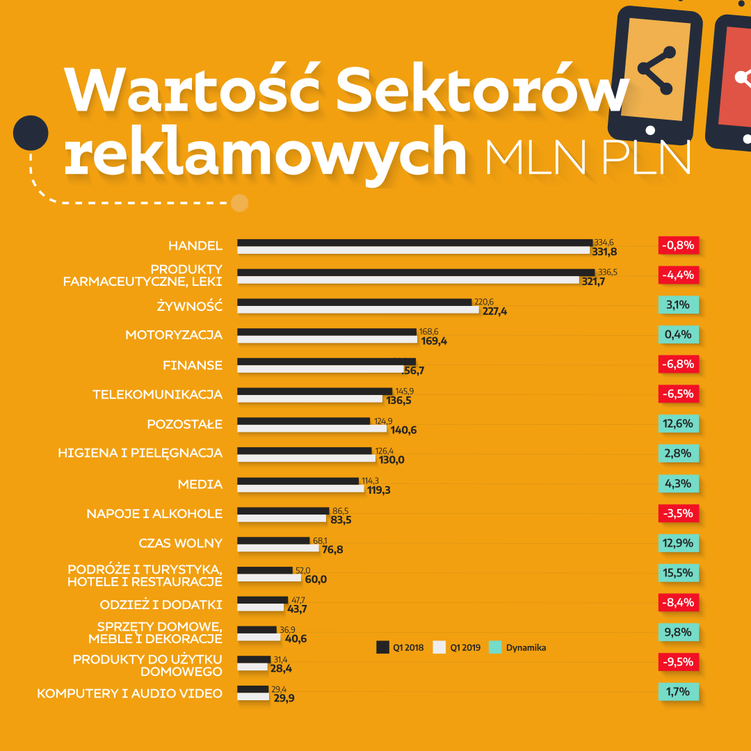 Branża handlowa w zeszłym kwartale przeznaczyła na reklamy 331,8 mln zł, o 0,8 proc. mniej niż rok wcześniej. Wydatki sektora farmaceutycznego zmalały o 4,4 proc. do 321,7 mln zł, finansowego – o 6,8 proc. do 156,7 mln zł, telekomunikacyjnego – o 6,5 proc. do 136,5 mln zł, napojów i alkoholi – o 3,5 proc. do 83,5 mln zł, odzieżowego – o 8,4 proc. do 43,7 mln zł, a produktów do użytku domowego – o 9,5 proc. do 28,4 mln zł.