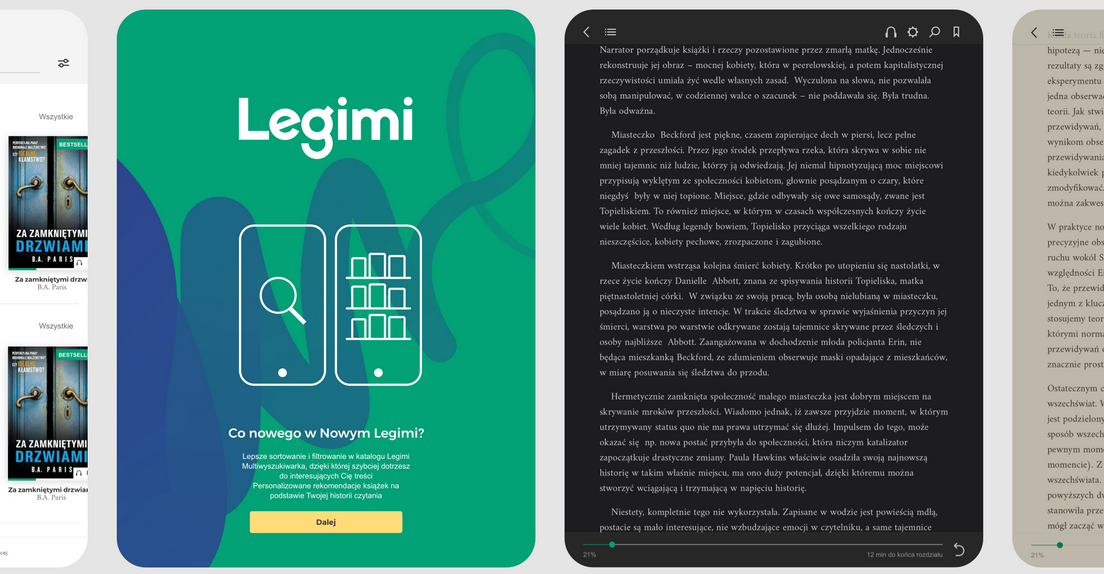 – Udostępnienie Legimi w wersji 3.0 jest zamknięciem kilkuletniego etapu rozwoju naszej usługi „Czytaj bez limitu”. Gdy w 2012 roku Legimi uruchamiało ten przełomowy projekt na polskim rynku, katalog liczył zaledwie 2 tysięcy publikacji do czytania na iPadach. Dziś oferujemy 60 tys. tytułów – ebooków, audiobooków i ich połączenia w formie tzw. „synchrobooków”. Jako jedyna platforma abonamentowa w Polsce nie tylko udostępniamy aplikacje na popularne systemy mobilne, ale także przewidziane dla „moli książkowych” e-czytniki – w tym najbardziej popularnego Kindla. Legimi jest też dostępne za darmo w kilkuset bibliotekach w Polsce. Obecnie przyszedł czas na adekwatną formę dla tak bogatej i wciąż rosnącej oferty treści – dodaje Mikołaj Małaczyński, prezes Legimi.