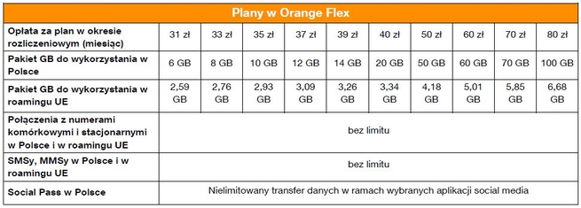 W ofercie Orange Flex znajduje się 10 pakietów, z których każdy oferuje darmowe połączenia na numery komórkowe i stacjonarne oraz brak opłat przy obsłudze wiadomości SMS/MMS. Pakiety różni jednak wielkość miesięcznego limitu gigabajtów. Najtańszy pakiet kosztuje 31 zł i oferuje miesięcznie 6 GB, za najdroższy z limitem 100 GB miesięcznie trzeba zapłacić 80 zł.