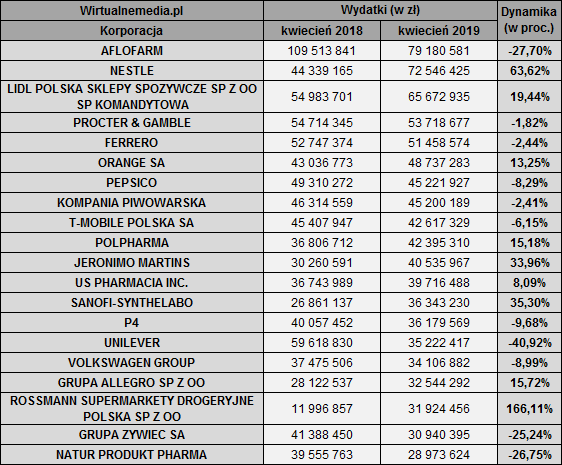 Najwięcej na reklamę w telewizji – 79,18 mln zł – w kwietniu 2019 roku wydała firma Aflofarm. Jej wydatki spadły rok do roku o 27,70 proc. Kolejne miejsca zajęły: Nestle (72,55 mln zł; do góry o 63,62 proc.) i Lidl Polska (65,67 mln zł; + 19,44 proc.).