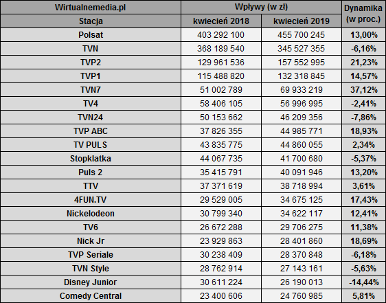 Podium uzupełnia TVP2 (157,55 mln zł; wzrost o 21,23 proc.), a oczko niżej znalazła się TVP1 (132,32 mln zł; + 14,57 proc.).
